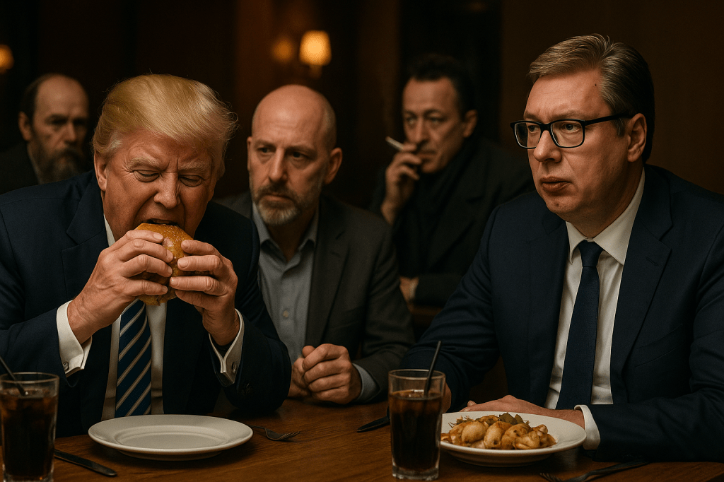 Trump ate a cheeseburger with bacon, while Vučić, across from him, sighed over a plate of stuffed squid that kept slipping off his fork, as if unwilling to be part of the story. “No one makes squid like my mother,” he thought. Both drank Coke Zero.