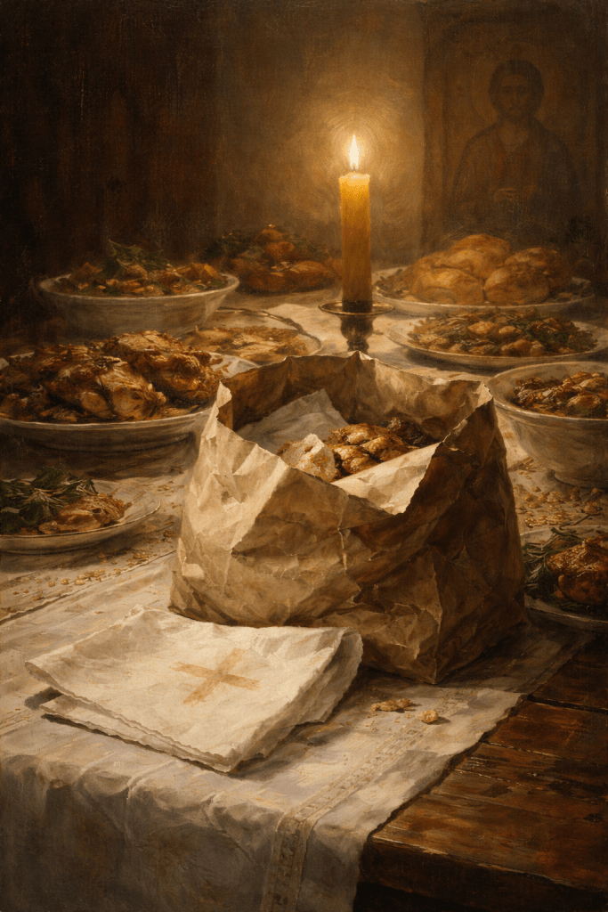 The host walked us to the door and packed “leftovers” into a bag — roast meat, some stuffed cabbage, small cakes wrapped in napkins. As we said goodbye, the priest looked at me briefly. He said nothing. I sensed understanding in his gaze.